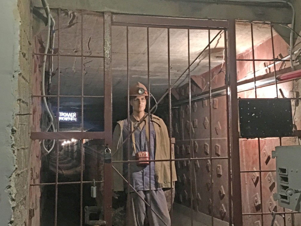 No fim de um dos corredores dentro do bunker, um boneco representa um trabalhador soviético fiscalizando o local. (Foto: Adriane Schultz/ G1)