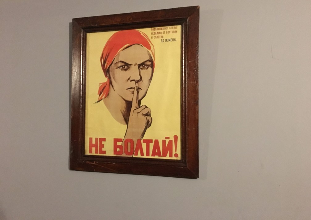 Cartaz soviético alerta sobre a importância de manter o silêncio e não fazer fofocas. (Foto: Adriane Schultz/ G1)